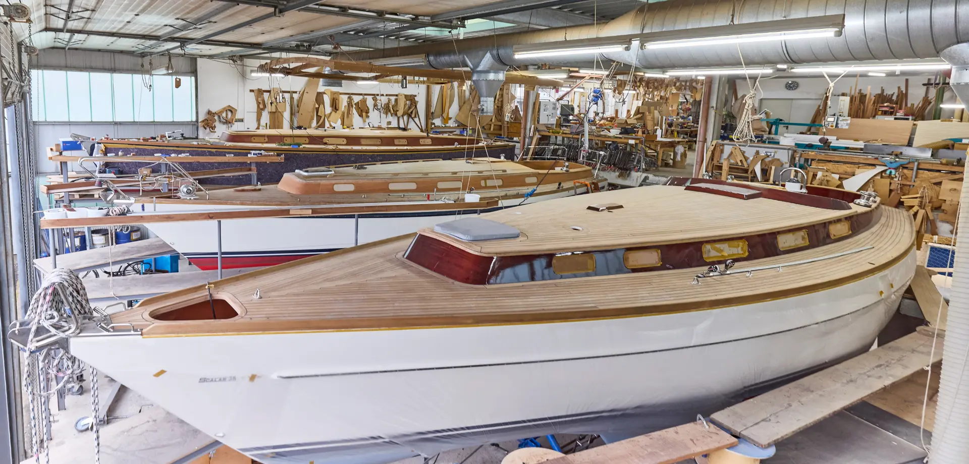 In Kappeln an der Schlei wird in einer der kleinsten aber feinsten Serienwerften Deutschlands an Holz nicht gespart. Sorgfältig angepasste Niedergangseinfassung, liebevoll gefertigte Innendetails oder das 15 Millimeter starke Teakdeck einer Scalar zeugen von solidem Bootsbauhandwerk.